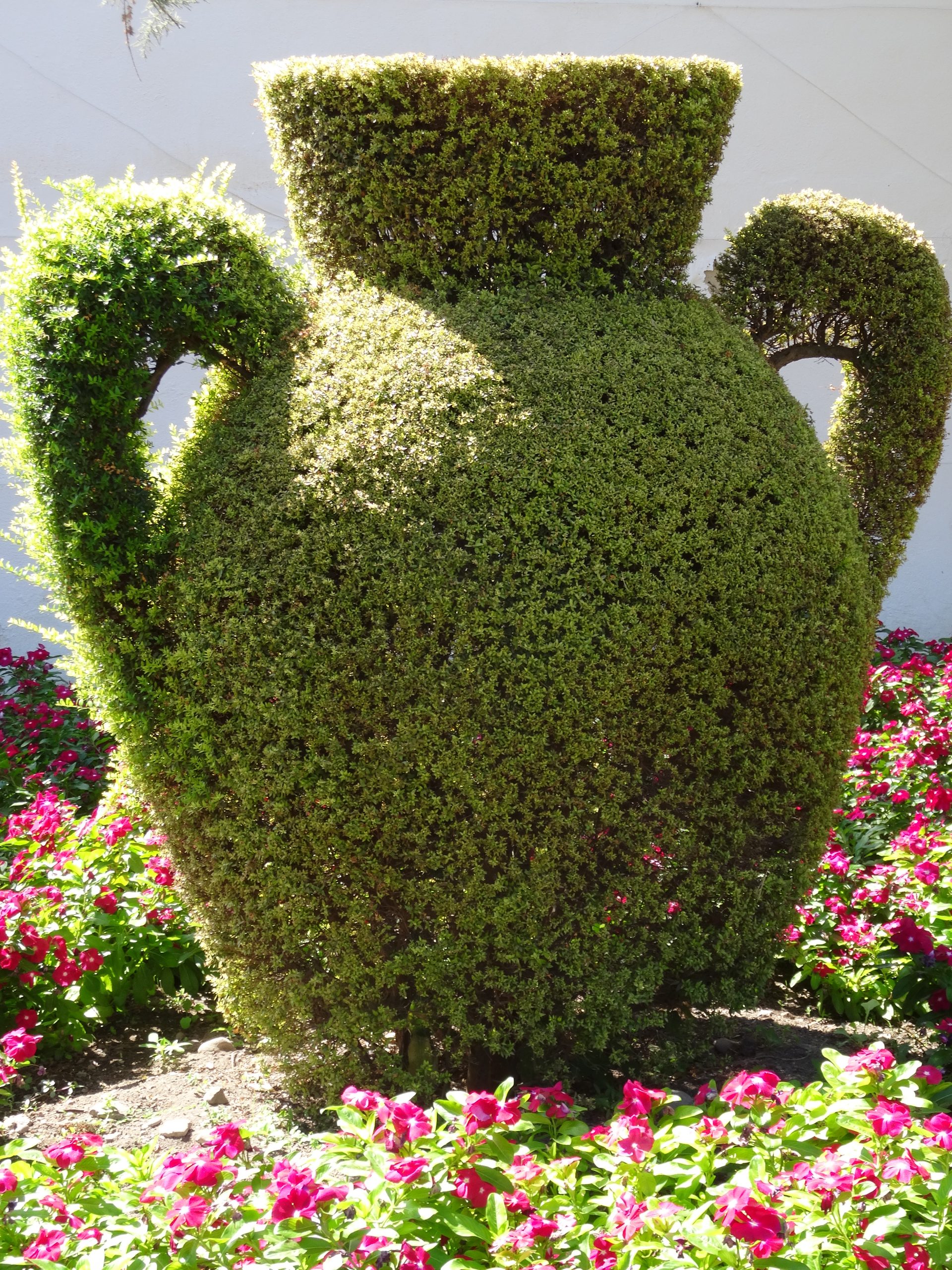 It was HOT HOT HOT and people were utilizing every patch of shade – moving from one tree to the next while waiting to get inside. There was a line of horse-drawn coaches (Gharries) patiently waiting for customers but not doing much business – 45 euros for an hour seemed a bit steep. The gardens were the star of the show though . . . all different . . . some shaded with fountains and geometric beds of agapanthus plus an unusual magenta flower . . . others were open and formal. Long water gardens with arcing spouts of water and edged with flowers led to the garden of kings with topiary shaped like towers and amphora. You