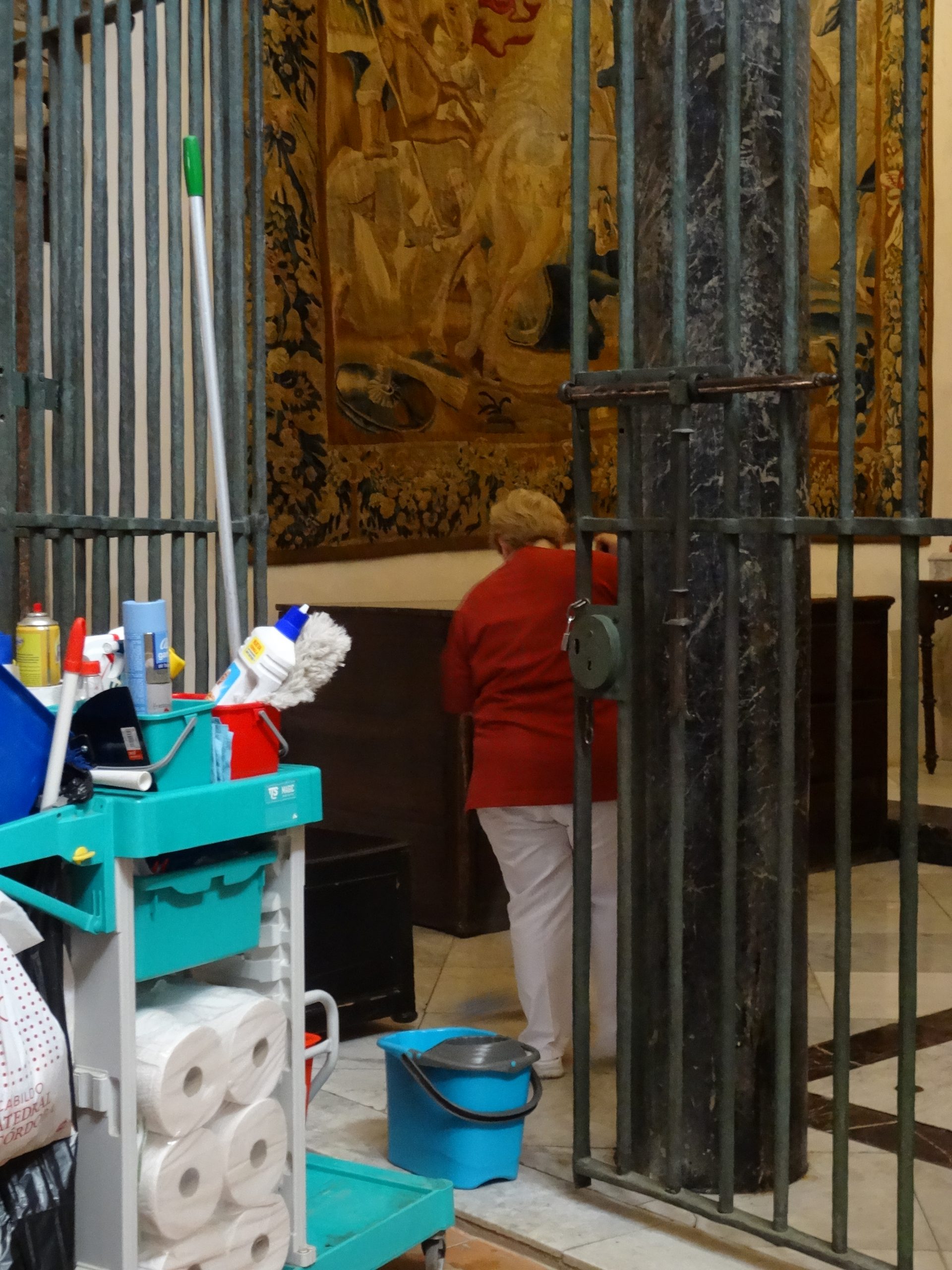 combination indeed. There were many different shrines and golden statues dedicated to Christian Saints . . . ancient holy books . . . uncovered carvings dating back to 12th century Moorish times. But one photo opportunity took my fancy . . . a Senora with cleaning cart, mopping the floor of one of the shrines. Cleanliness must surely be next to Godliness. See photos below.