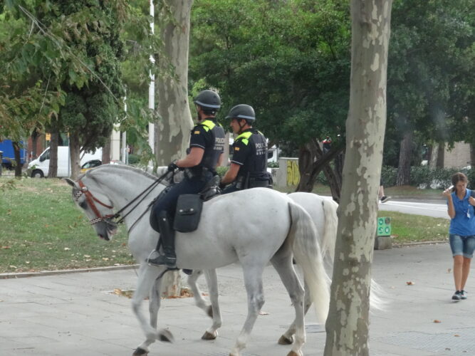 A short walk to the bus station . . . in fact with Barcelona’s system of one-way streets, a bus or taxi would take just as long. Our seats were upstairs which gave a great view in front and to the side. Stopping at some traffic lights, two police on horseback went across the crosswalk – the white horses looking distinctly like Lippizzaners in their grace and posture – beautiful. On the slopes overlooking the port, just south of the city was a curious cemetery built right into the cliffs – Cementiri de Montjuic. Built in 1883 when space was limited, it now houses 150,000 burial plots and niches, with the remains of more than a million in total. https://www.barcelonayellow.com/bcn-photos/661-montjuic-cemetery-barcelona