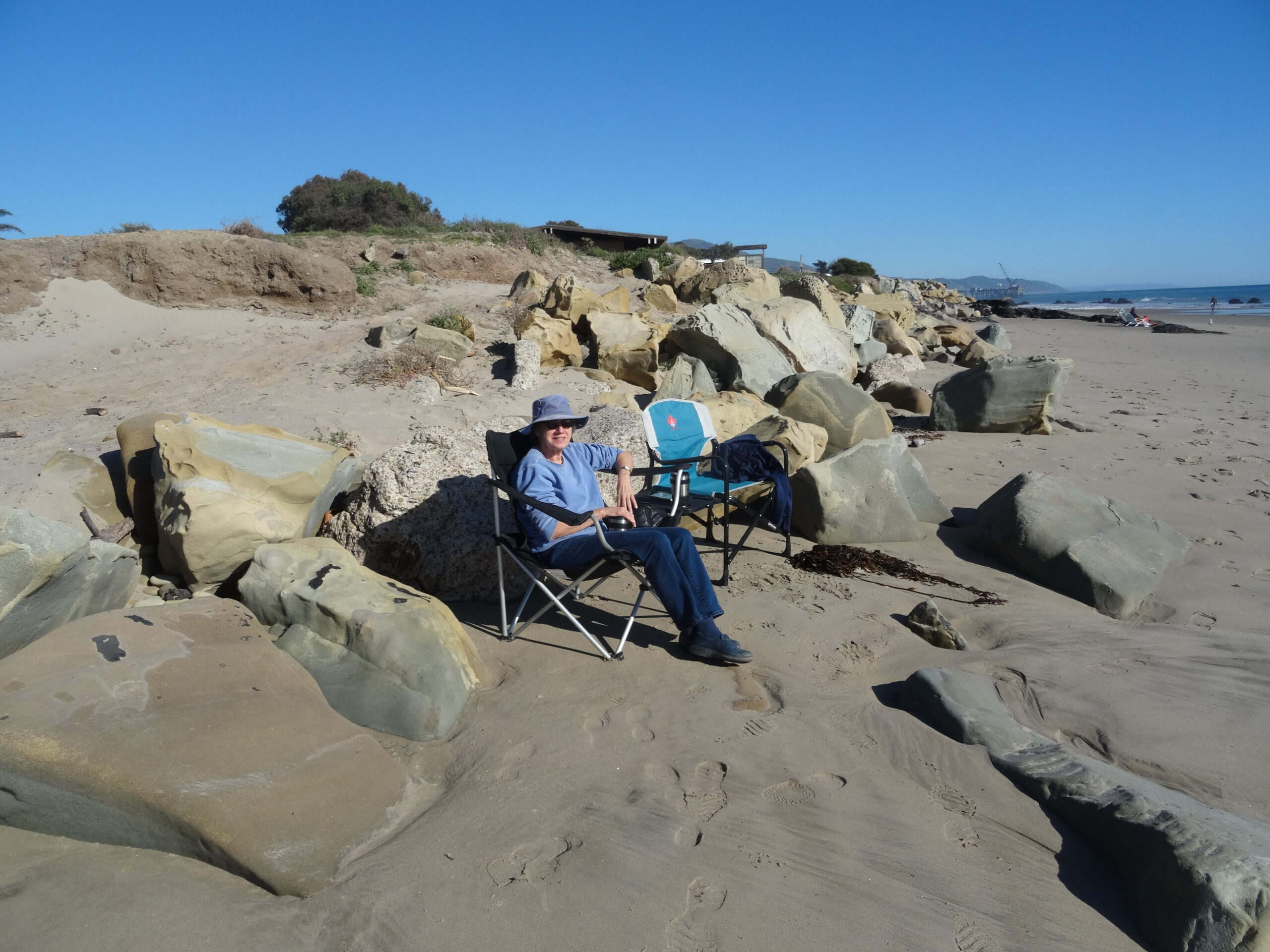 Oooo! Elephant Seal View Point! But it was crammed with vehicles and people wielding cameras, so we carried on. And just a mile or so further on we were rewarded with a wide parking area and just a couple of RVs. We made sandwiches and sat in the sun watching the waves as lazy hawks drifted the air currents right in front of us and egrets posed theatrically on the rocks. Just down the beach a family of elephant seals reposed in the sun . . . indistinguishable from logs except for the occasional twitch and wobble of the nose.
